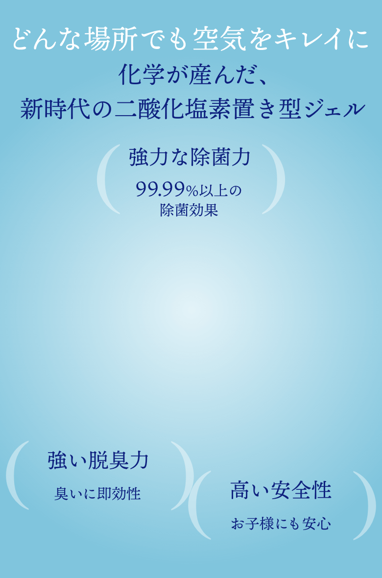 二酸化塩素の強い酸化力によって、匂いの物質を根本から分解して素早く取り除きます。無臭に近く、塩素臭はほとんどありません。